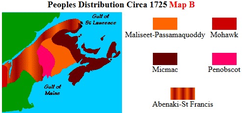 MAP B (shown above) showed the Wabanaki peoples Circa 1725 as Micmac, Maliseet-Passamaquoddy, Penobscot (a.k.a. Eastern Abenaki), and Abenaki-St.Francis (meaning both the Abenaki remaining in New England and the Abenaki regrouped in & working out of New France – this latter category a.k.a. Western Abenaki). This also implies that, by c.1725, the Etchemin had regrouped as Maliseet & Passamaquoddy, and the (per se) Pennacook (a.k.a. Central Abenaki) had dispersed in all directions to merge with neighboring peoples.